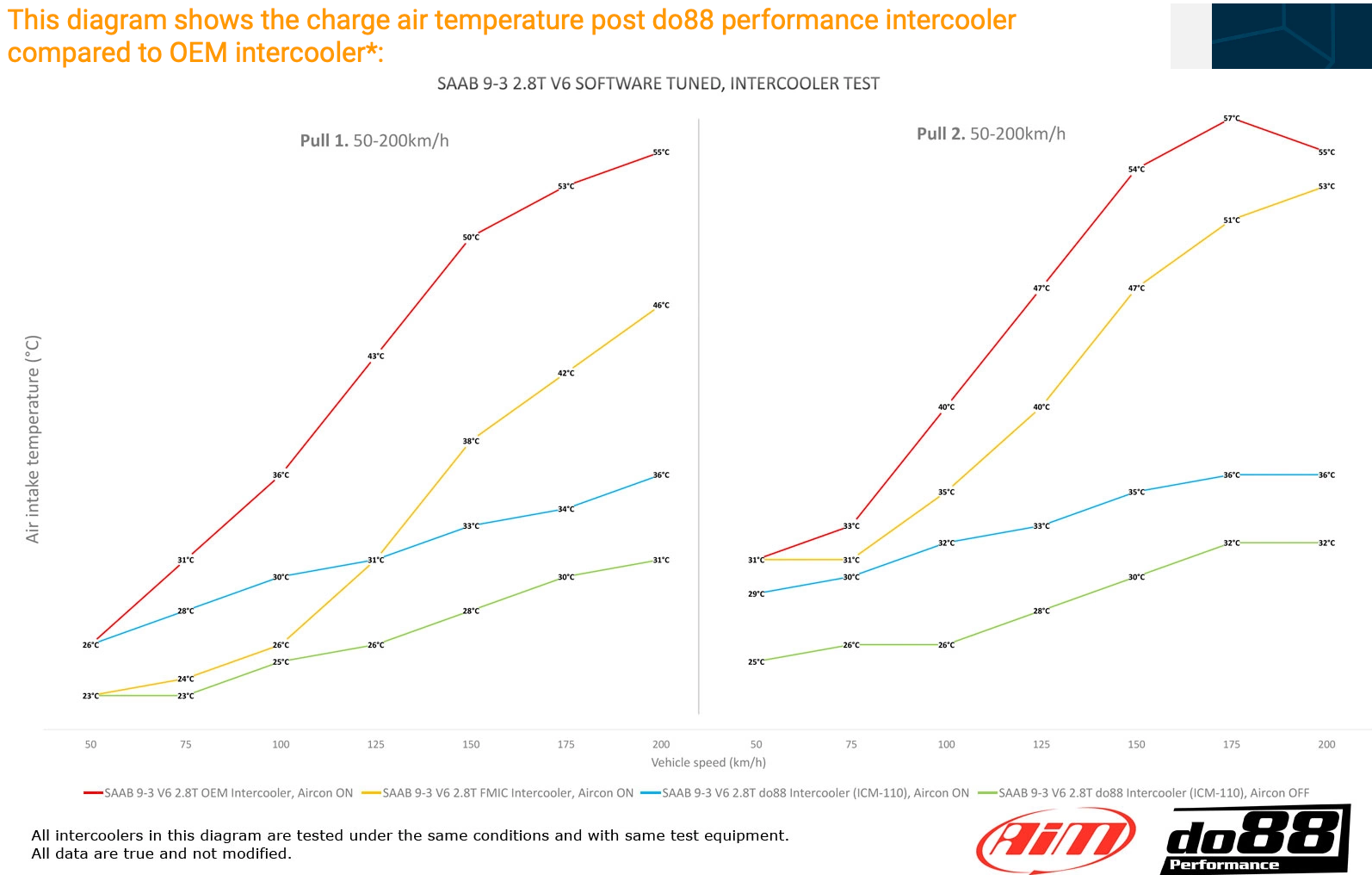 The best SAAB 9-3 1,9 TTiD performance intercooler on the market! This performance intercooler is developed by do88 to replace the original / OEM intercooler and gives true performance without the need of rebuilding the whole car! Significant advantages with do88 performance intercooler (OEM intercooler): - Core volume: 13770m3 (7725cm3), do88 is 78% larger! - Air flow at 0,15bar/2,18psi pressure drop: 356CFM (329CFM), do88 8% higher! See diagram below! - Post intercooler air temperature at same conditions: 36°C (57°C), do88 21°C lower! See diagram below! - Fits all cars in list below! do88 performance intercooler are an all-aluminum construction with cad designed, flow optimized cast end tanks and optimized core design to achieve best possible cooling efficiency combined with lowest possible pressure drop! Always remember that the OEM intercooler was designed for the power level the car was built for and a power increase or even very hard use of the car in a standard version may cause that the OEM intercooler don’t have the performance you need. So only after engine software tune do88 performance intercooler will give a performance increase over the OEM intercooler! The OEM intercooler have plastic tanks that don’t keep up with higher boost levels very well so the do88 performance intercooler will also add reliability! A common misunderstanding is that an intercooler installed in this position cannot provide good performance and a front mounted intercooler / FMIC would be much better. But actually the do88 performance intercooler are far better than most FMIC installations where only a core with small front surface are possible to install and often also installed partially behind the bumper beam which will reduce cooling capacity even further and often cooling below the OEM intercooler are achieved. do88 performance intercooler comes with all hardware necessary for installation. This intercooler has of course all brackets for radiator, AC-condenser and air guides. For installation instruction Click Here! |